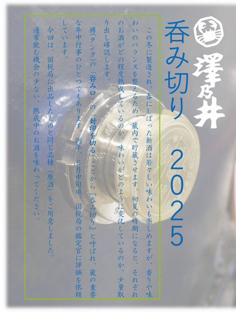 春にしぼった新酒は若々しい味わいも楽しめますが、香りや味わいのバランスを整えるため、蔵内で貯蔵します。初夏の時期になると、それぞれのお酒がどの程度熟成しているのか、味わいがどのように変化しているのか、少量取り出し確認します。樽(タンク)の「呑み口」の「封印を切る」ことから『呑み切り』と呼ばれ、蔵の重要な年中行事のひとつでもあります。例年東京都酒造組合では6月中旬頃、国税局の鑑定官に評価を依頼しています。